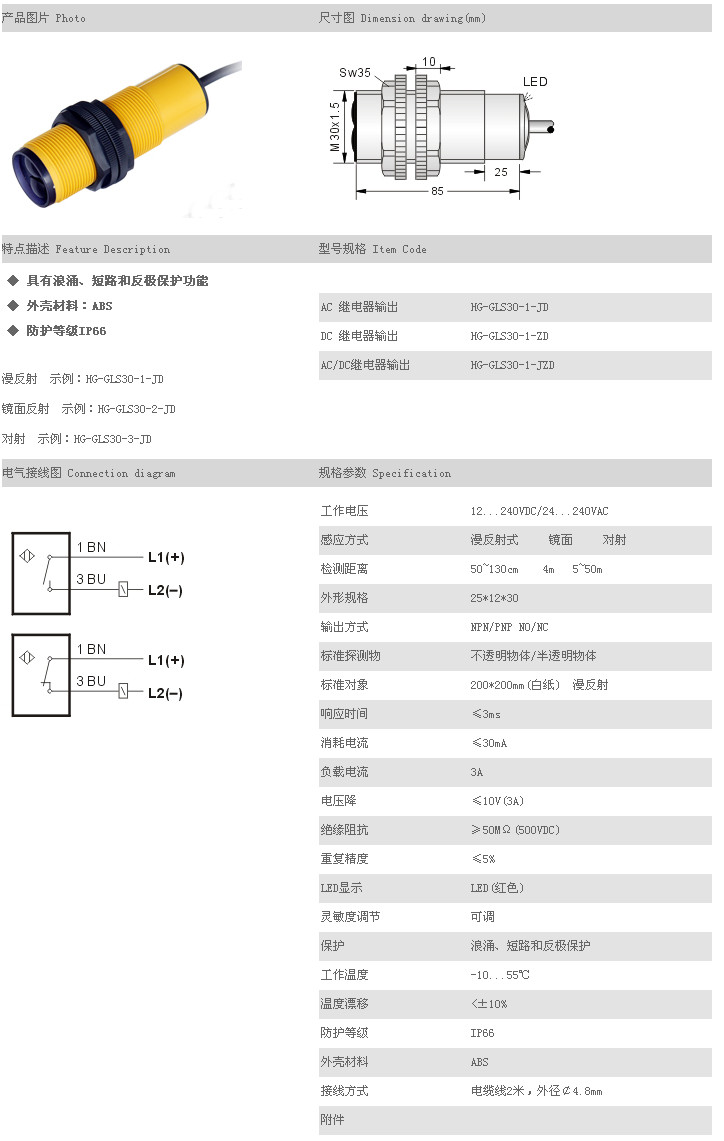 圓柱型光電開(kāi)關(guān)/傳感器 HG-GLS30-1-JD,HG-GLS30-1-ZD,HG-GLS30-1-JZD,