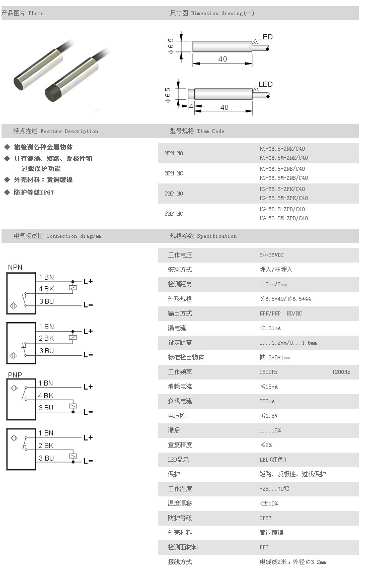 超小型接近開(kāi)關(guān) HG-Y6.5-ZNK/C40,HG-Y6.5M-ZNK/C40,HG-Y6.5-ZNB/C40,HG-Y6.5M-ZNB/C40,HG-Y6.5-ZPK/C40,HG-Y6.5M-