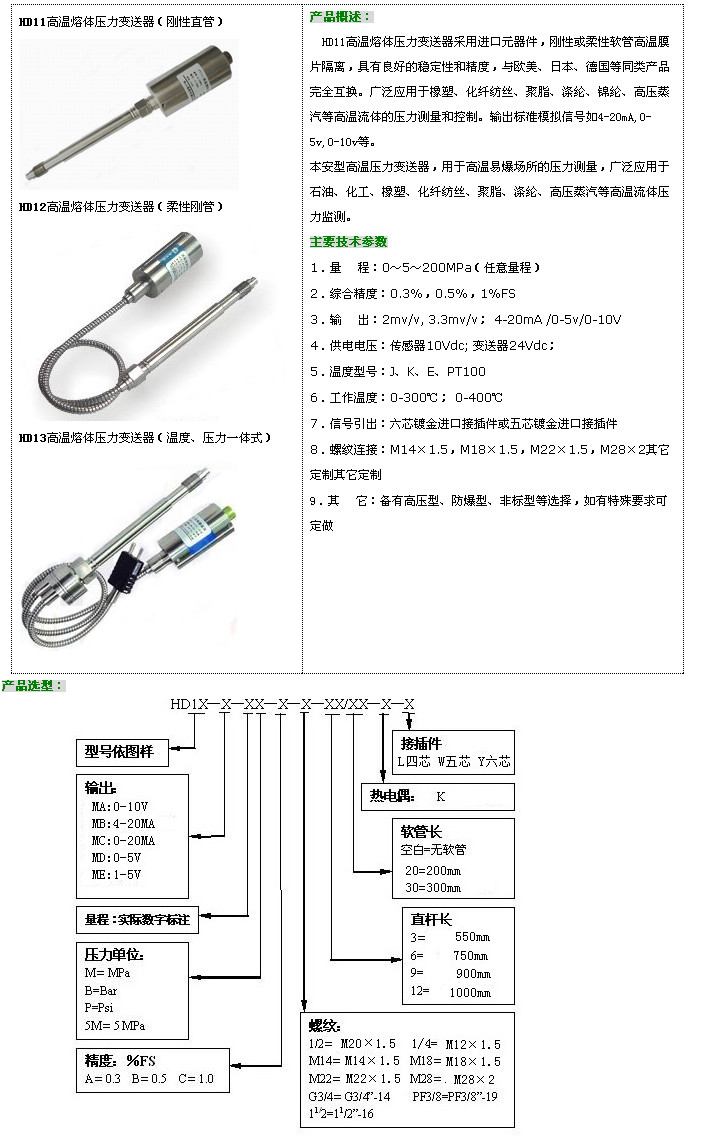 HD11-MA,HD11-MB,HD11-MC,HD11-MD,HD11-ME,HD11,高溫熔體壓力變送器
