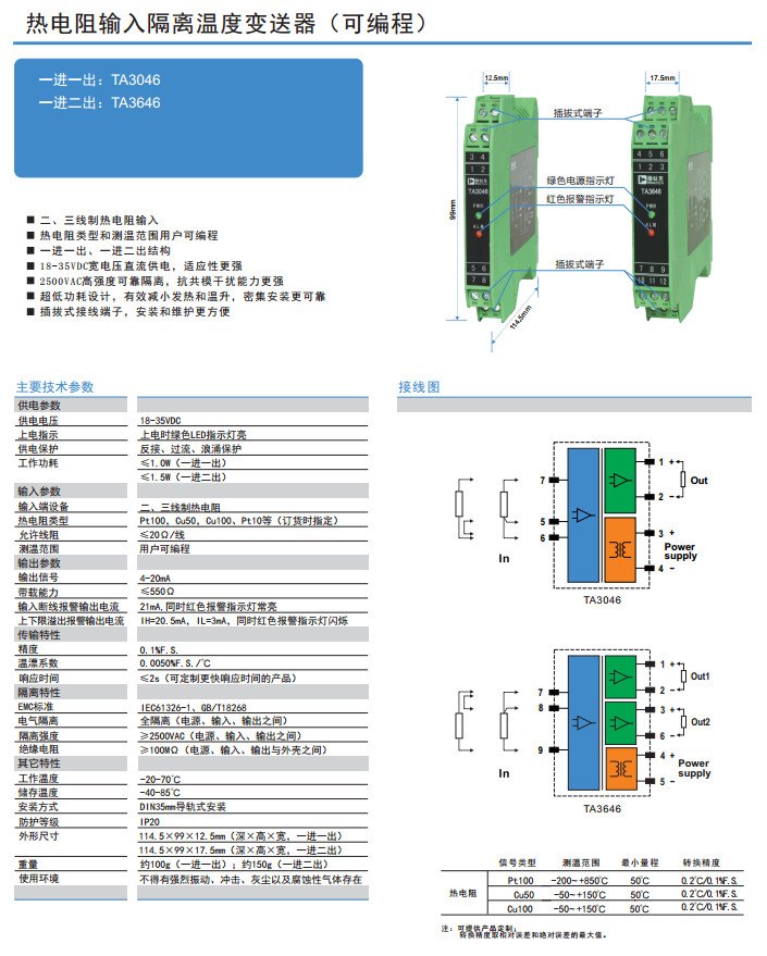 TA3046,TA3646,熱電阻輸入隔離溫度變送器