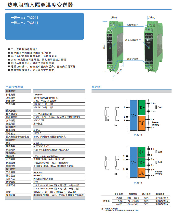 TA3041,TA3641,熱電阻輸入隔離溫度變送器