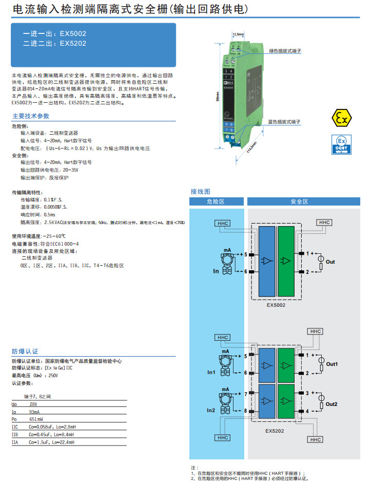 EX5002,EX5202,電流輸入檢測端隔離式安全柵(輸出回路供電)