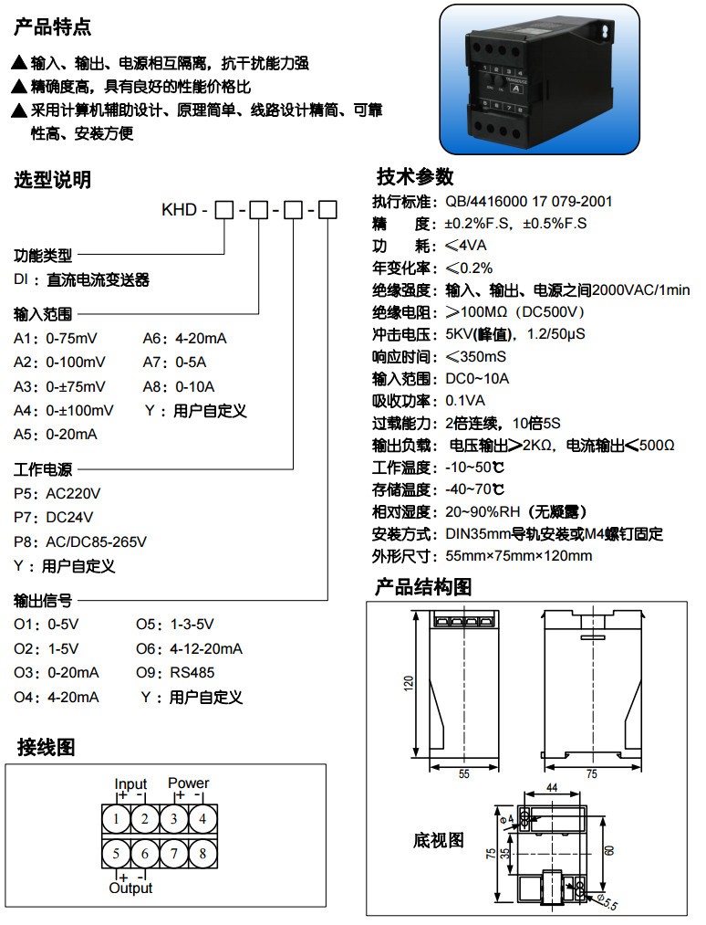 KHD-DI-A1-P5-O1,KHD-DI-A4-P7-O2,KHD-DI-A1-P8-O4,KHD-DI-A8-P7-O9,KH型直流電流變送器