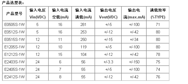 E0505S-1W,E0512S-1W,E0515S-1W,E1205S-1W,E1212S-1W,E2403S-1W,E2405S-1W,E2412S-1W電壓輸入非穩(wěn)壓雙輸出隔離模塊 |
