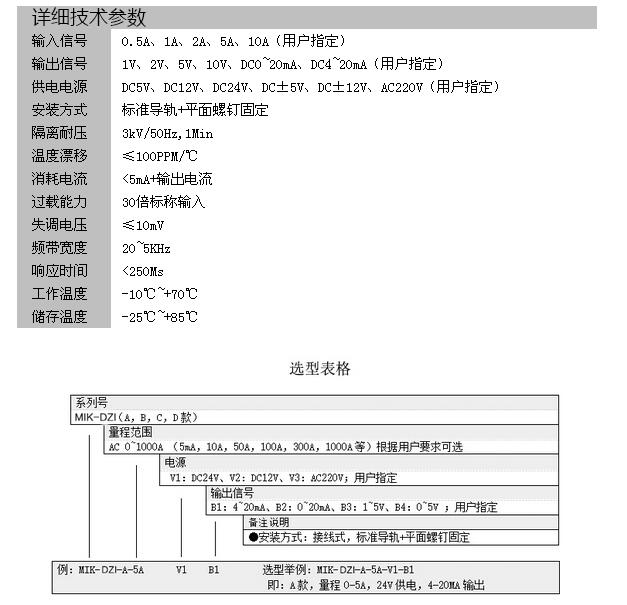 MIK-DZI-5A-, MIK-DZI-5A-V1-B1,單項直流/交流/電流變送器/傳感器 直接接線式.