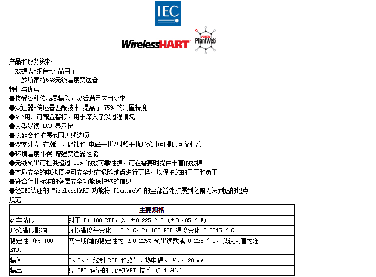 羅斯蒙特 648 無線溫度變送器包括一個大型易讀顯示屏、用戶可配置的過程警報(bào)、長距離和擴(kuò)展范圍天線選項(xiàng)以及用于增強(qiáng)準(zhǔn)確性的變送器-傳感器匹配技術(shù)。 648 無線溫度變送器完全兼容經(jīng) IEC 認(rèn)證的 WirelessHART 網(wǎng)絡(luò),是一項(xiàng)可提供豐富診斷數(shù)據(jù)和可靠性能的智能無線溫度解決方案。