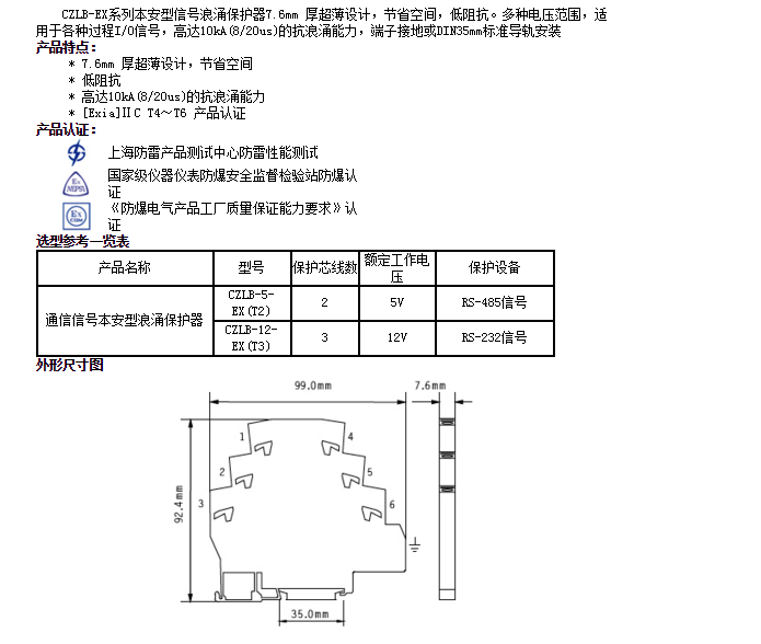 CZLB-5-EX(T2),CZLB-12-EX(T3),本安型浪涌保護(hù)器