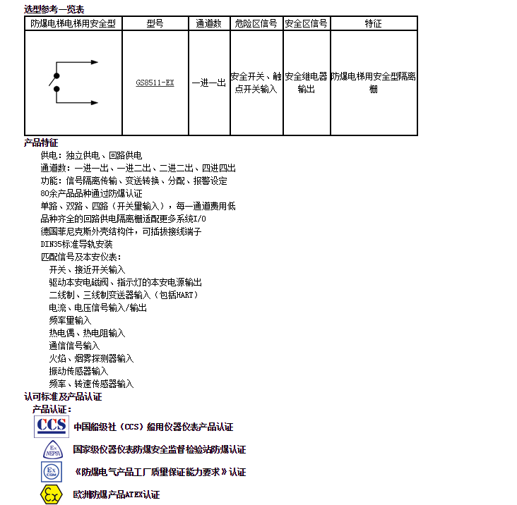 GS8511-EX,防爆電梯用安全型隔離式安全柵