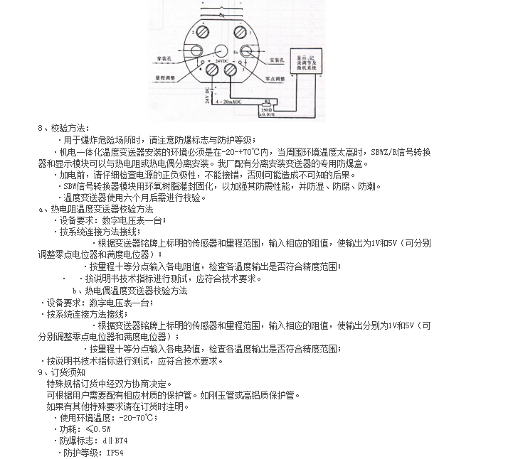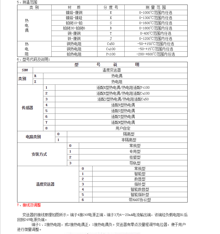 1、輸入信號:熱電偶:K、E、J、B、S、T、N。熱電阻:Pt100、Cu50、Cu100(三線制、四線制)。智能型溫度變送器的輸入信號可通過手持器和PC機任意設(shè)置;