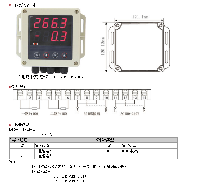 NHR-XTRT系列溫度遠傳監(jiān)測儀采用了表面貼裝工藝,全自動貼片機生產,具有很強的抗干擾能力。本儀表支持兩路PT100輸入,實現對溫度物理的測量顯示,帶RS485通訊輸出功能,帶雙屏數碼管顯示,上窗口顯示第1路測量值,下窗口顯示第2路測量值。 |
