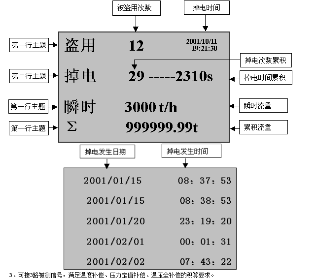 (2)帶記錄儀功能時(shí)可記錄用戶指定時(shí)刻的流量累積子供隨時(shí)抄錄登記,可以記錄下非法輸入密碼的次數(shù)