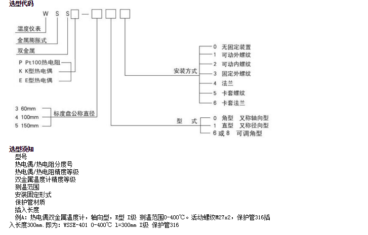 | 型號 | 分度號 | 測溫范圍℃ | 精度等級 | 保護(hù)管材料 | 插入長度 |
