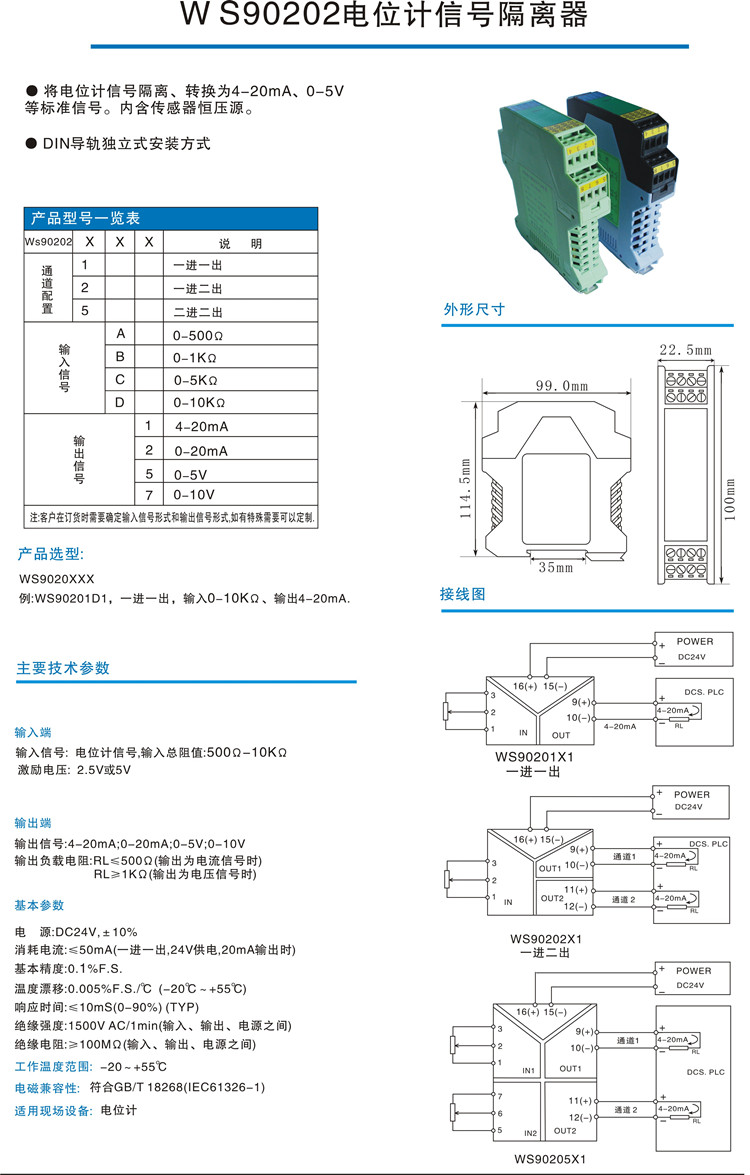 WS9020電位計(jì)變送器 電位計(jì)信號(hào)調(diào)理器技術(shù)參數(shù)詳細(xì)介紹: