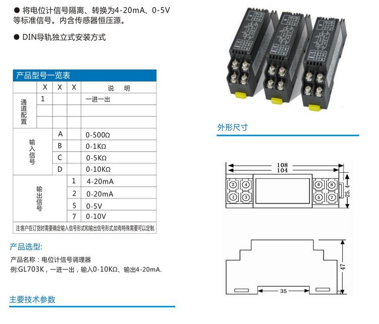 GL703K信號隔離調(diào)理器輸入范圍:0-500Ω 0-1KΩ、0-10KΩ、0-20KΩ等用戶特定規(guī)格