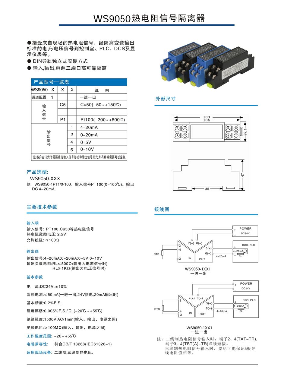 WS9050熱電阻信號隔離器,接受來自現(xiàn)場的熱電阻信號,經(jīng)隔離變送輸出標準的電流/電壓信號到控制室、PLC、DCS及顯示儀表等,輸入、輸出、電源三端口隔離,DINT型導軌安裝