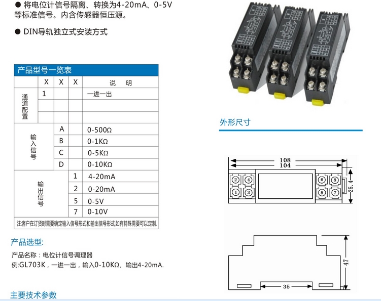GL703K信號隔離調(diào)理器輸入范圍:0-500Ω 0-1KΩ、0-10KΩ、0-20KΩ等用戶特定規(guī)格