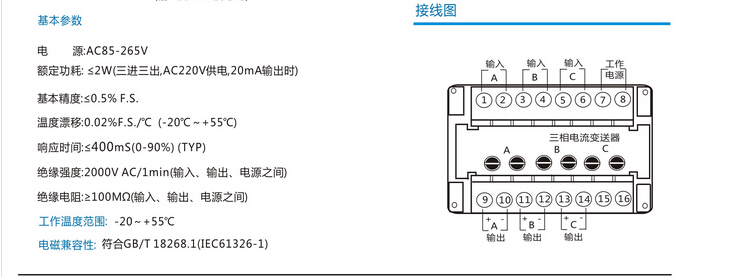 三相電流變送器輔助電源:AC/DC220V ,精 度:0.5級
