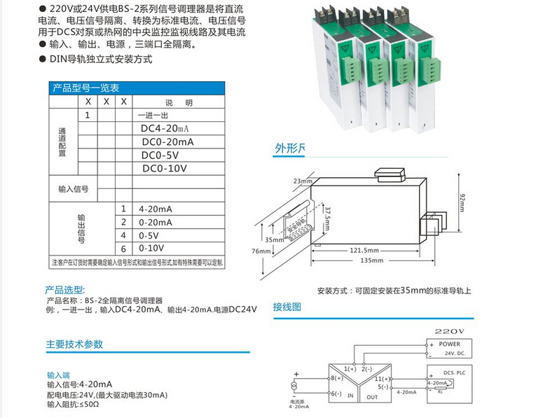 BS-2全隔離信號(hào)調(diào)理器 輸入范圍:4-20mA標(biāo)準(zhǔn)信號(hào)