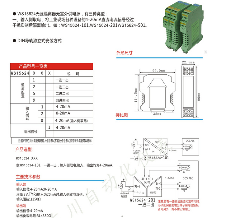 將輸入的四路信號隔離輸出,無需外接電源可正常工作,輸入輸出隔離,傳輸精度高,DIN T型導(dǎo)軌安裝