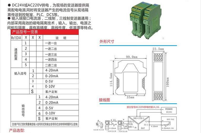 WS15244信號隔離器分配器,全隔離信號分配器 隔離柵,信號隔離器模塊,安全柵,電流轉(zhuǎn)換模塊。將輸入信號變換為兩路相互隔離的信號,低功耗,低熱量,低漂移,DIN T型導(dǎo)軌安裝