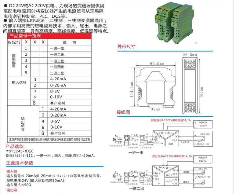 WS15243隔離柵信號(hào)隔離器,全隔離信號(hào)分配器 隔離柵,信號(hào)隔離器模塊,安全柵,電流轉(zhuǎn)換模塊。將輸入信號(hào)變換為兩路相互隔離的信號(hào),低功耗,低熱量,低漂移,超薄DIN T型導(dǎo)軌安裝