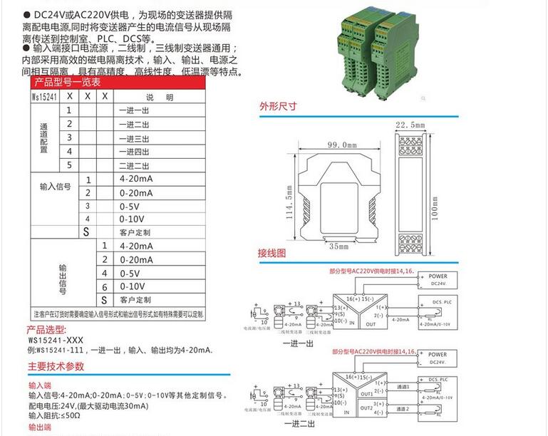 WS15241有源信號隔離器,全隔離輸出信號分配器 隔離柵,信號隔離器模塊,安全柵,電流轉(zhuǎn)換模塊。將輸入信號變換為兩路相互隔離的信號,低功耗,低熱量,低漂移,DIN T型導軌安裝