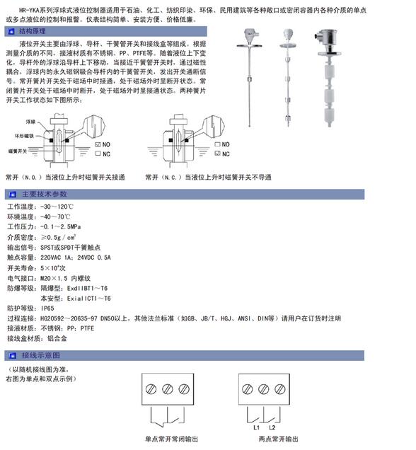 HR-YKA系列浮球式液位控制器適用于石油、化工、紡織印染、環(huán)保、民用建筑等各種敞口或密閉容器內(nèi)各種介質(zhì)的單點(diǎn)或多點(diǎn)液位的控制和報(bào)警。儀表結(jié)構(gòu)簡單、安裝方便、價(jià)格低廉。