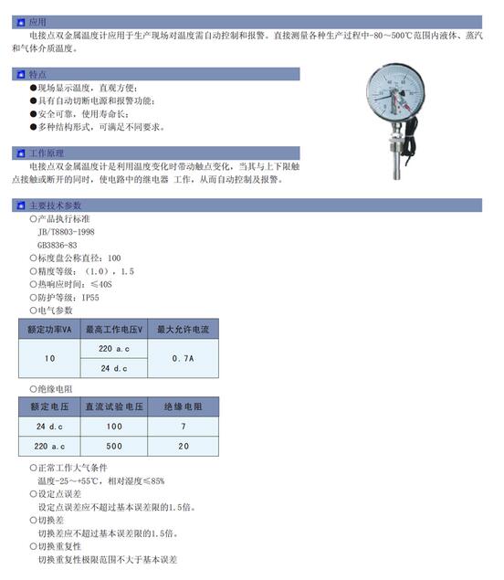 電接點雙金屬溫度計應用于生產現(xiàn)場對溫度需自動控制和報警。直接測量各種生產過程中-80~500℃范圍內液體、蒸汽和氣體介質溫度。