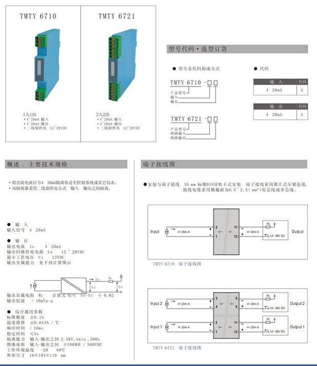 直流電流輸入,二線制隔離器 TMTY6710 1入1出 TMTY6721 2入2出