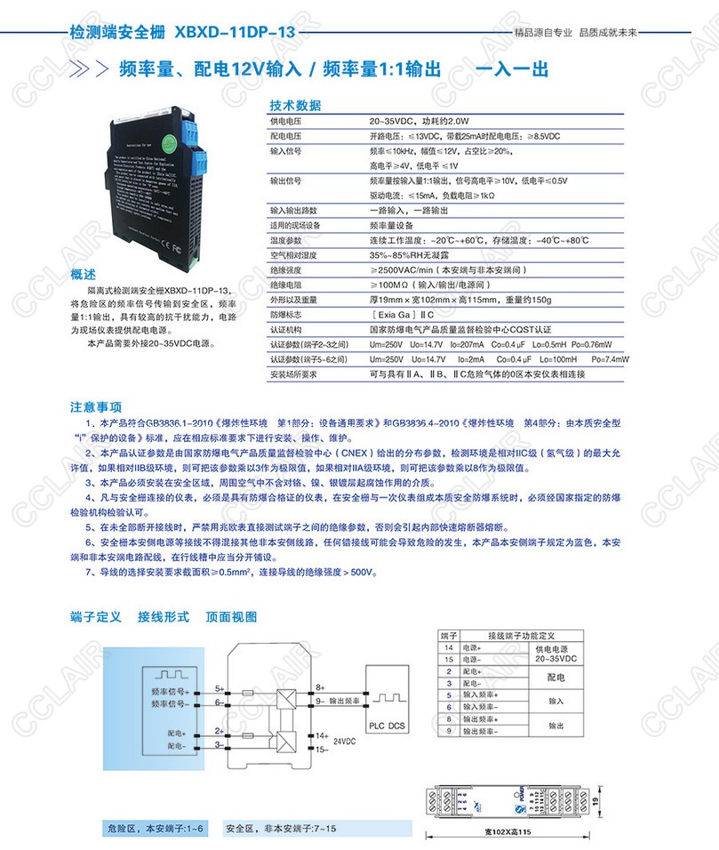 XBXD-11DP-13檢測端安全柵 配電12V頻率量輸入,1:1輸出(一入一出)