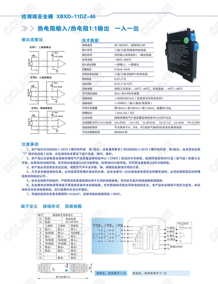 XBXD-11DZ-46檢測端安全柵 熱電阻輸入,1:1輸出(一入一出)