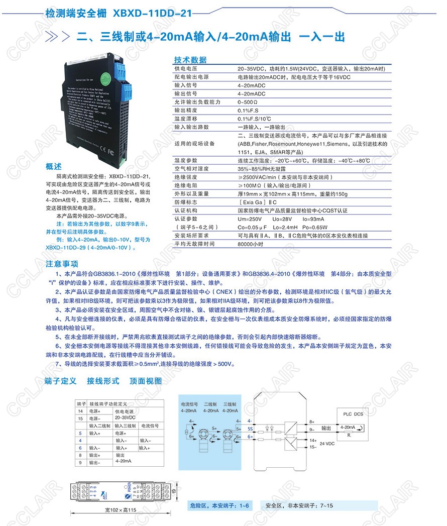 XBXD-11DD-21,XBXD-11DD-29檢測安全柵二、三線制或直流4-20mA輸入,4-20mA輸出(一入一出)