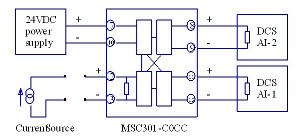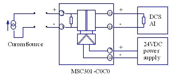 例1:輸入4~20mADC,輸出4~20mADC,一入一出,則型號為:MSC301-C0C0