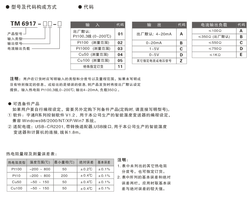 是智能型的熱電阻溫度變送器, 有 USB 編程接口, 可以使用專用的編程電纜連接這個(gè)溫度變送器和PC機(jī),通過軟件在PC機(jī)上進(jìn)行編程, 可以任意編程設(shè)定熱電阻分度號(hào)和測(cè)量溫度的量程范圍。
