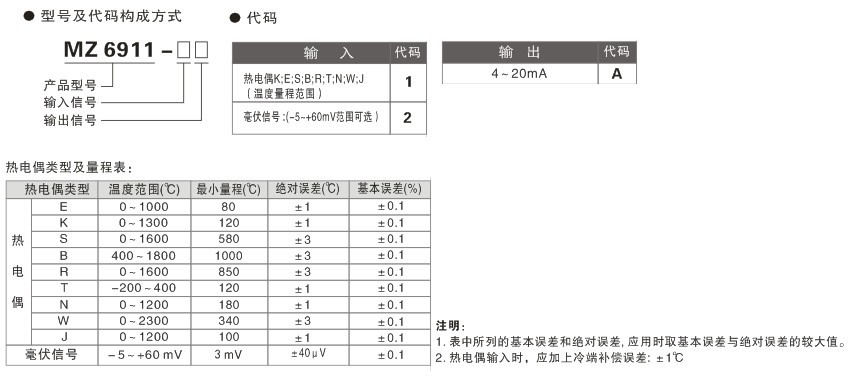 MZ6911 熱電偶溫度變送器 輸出外供電 一入一出特性
