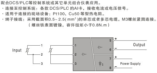 熱電阻信號(hào)輸入,經(jīng)過隔離, 轉(zhuǎn)換為固定量程的標(biāo)準(zhǔn)直流信號(hào)輸出。