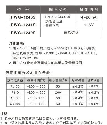 RWG-124□S 模擬熱電阻輸入溫度變送器 一入一出特性