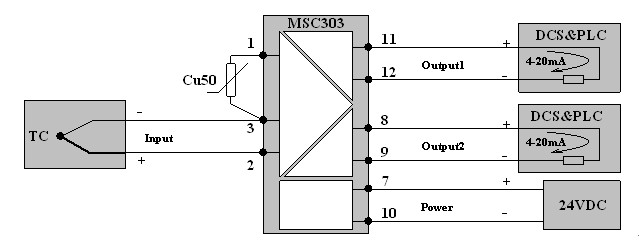 訂貨須知 訂貨時(shí)需寫明上述型號(hào)及代碼,同時(shí)有輸入輸出信號(hào)及溫度范圍 例1:輸入K型熱電偶:0~1200℃;輸出:4~20mADC,一入一出,則型號(hào)為MSC303-10C0,0~1200℃ 例2:輸入K型熱電偶:0~800℃;輸出一:1~5VDC, 輸出二:4~20mADC,一入兩出,則型號(hào)為MSC303-103C,0~800℃ MSC303 熱電偶溫度變送器