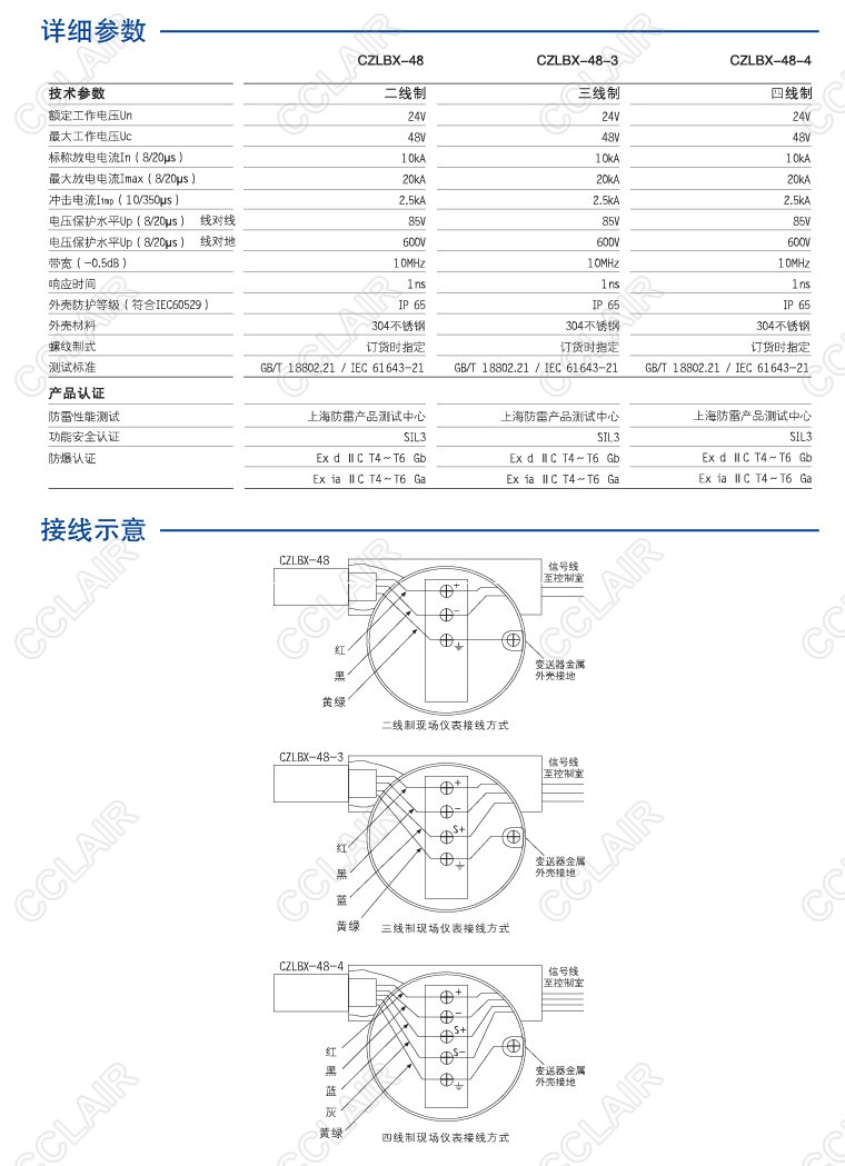 現(xiàn)場安裝型SPD,四線制,螺紋制式(訂貨時指定):M20×1.5、1/2″NPT、3/4″NPT,適合變送器、熱電阻、熱電偶、RS-485、RS-232、RS-422、流量計、電磁閥等現(xiàn)場設備的保護,隔爆、本安防爆雙認證。