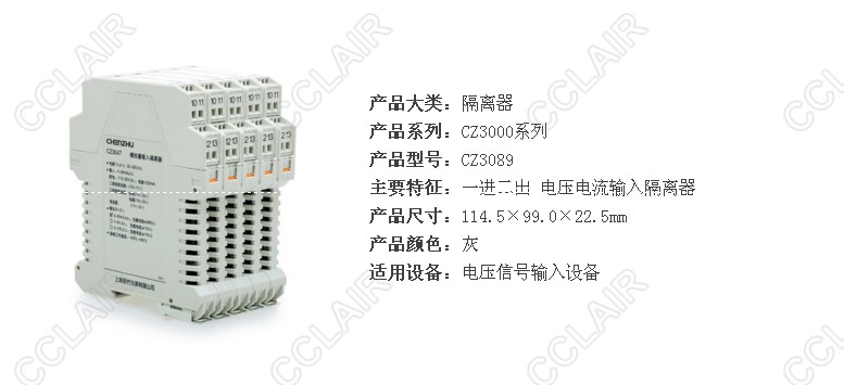 CZ3088 二進(jìn)二出 電壓電流輸入隔離器 二進(jìn)二出,支持多種電壓電流信號輸入,多種電壓電流信號輸入 可向現(xiàn)場儀表提供隔離電源 CZ3089 一進(jìn)二出 電壓電流輸入隔離器 一進(jìn)二出,支持多種電壓電流信號輸入,多種電壓電流信號輸入 可向現(xiàn)場儀表提供隔離電源