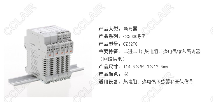 CZ3277 一進(jìn)一出 熱電阻、熱電偶輸入隔離器(回路供電) 信號(hào)類型和測量范圍可編程,PT100冷端傳感器,高精度自動(dòng)冷端補(bǔ)償,超量程、斷線檢測與報(bào)警功能。 CZ3278 二進(jìn)二出 熱電阻、熱電偶輸入隔離器(回路供電) 信號(hào)類型和測量范圍可編程,PT100冷端傳感器,高精度自動(dòng)冷端補(bǔ)償,超量程、斷線檢測與報(bào)警功能。