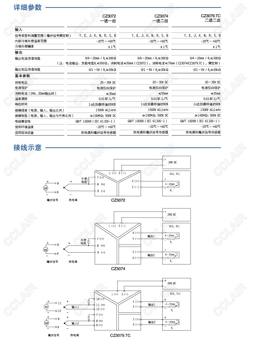 信號類型和測量范圍可編程,PT100冷端傳感器,高精度自動冷端補償,超量程、斷線檢測與報警功能。 CZ3074 一進二出 熱電偶輸入隔離器 信號類型和測量范圍可編程,PT100冷端傳感器,高精度自動冷端補償,超量程、斷線檢測與報警功能。 CZ3072 一進一出 熱電偶輸入隔離器 信號類型和測量范圍可編程,PT100冷端傳感器,高精度自動冷端補償,超量程、斷線檢測與報警功能。