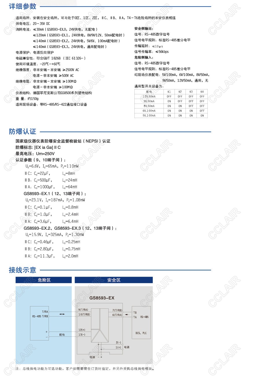 無配電;該產(chǎn)品需要獨立供電,電源、輸入和輸出三隔離。實現(xiàn)RS-485數(shù)字信號在危險區(qū)和安全區(qū)的雙向通信,并給現(xiàn)場儀表提供隔離電源。