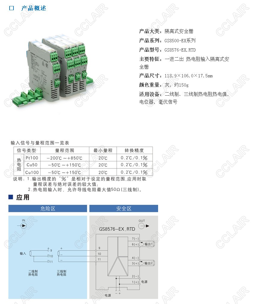 隔離式安全柵,將現(xiàn)場的熱電阻、熱電偶、毫伏信號、電位器信號轉(zhuǎn)換成0/4~20mA的電流信號或0~5V電壓信號,從危險區(qū)隔離傳送到安全區(qū)。它具有冷端補償功能,是智能型的,可通過計算機對熱電阻、熱電偶、電位器的分度號、量程范圍等進行組態(tài)。該產(chǎn)品需要獨立供電,電源、輸入和輸出的三隔離。
