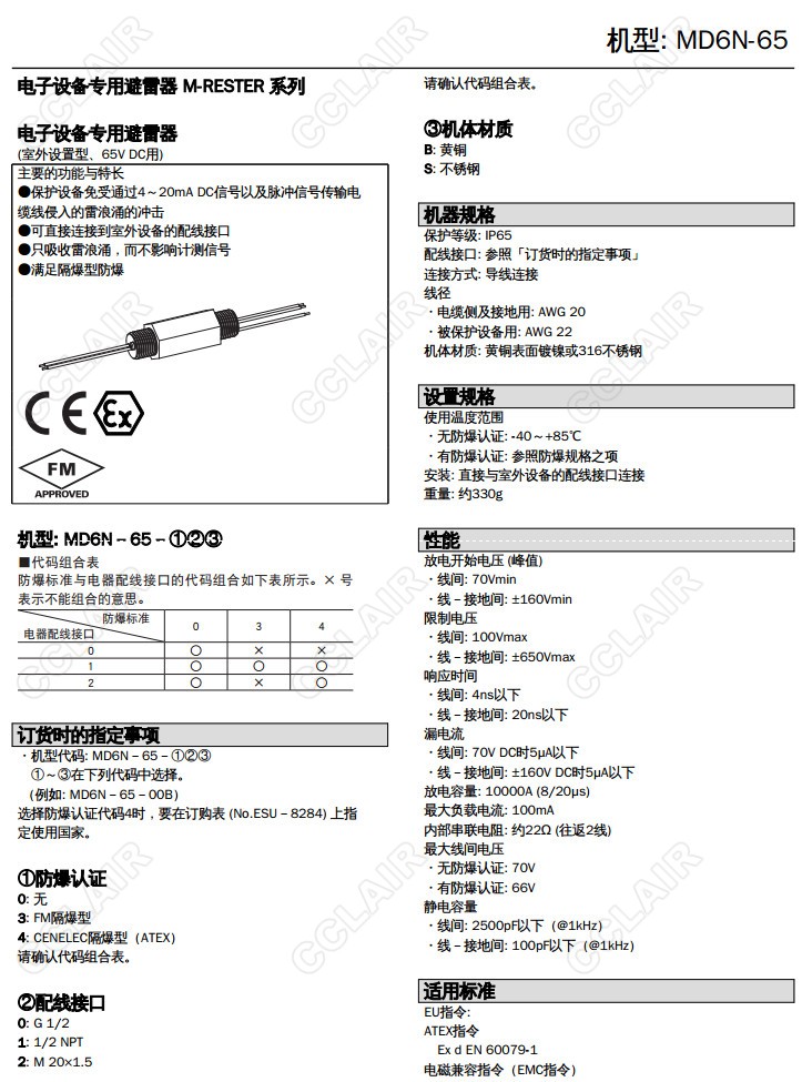MD6N-24/MD6N-65,MD6N-24-00B,4-20mA直流、脈沖信號用 室外安裝型 引線連接型 突頭型,避雷器