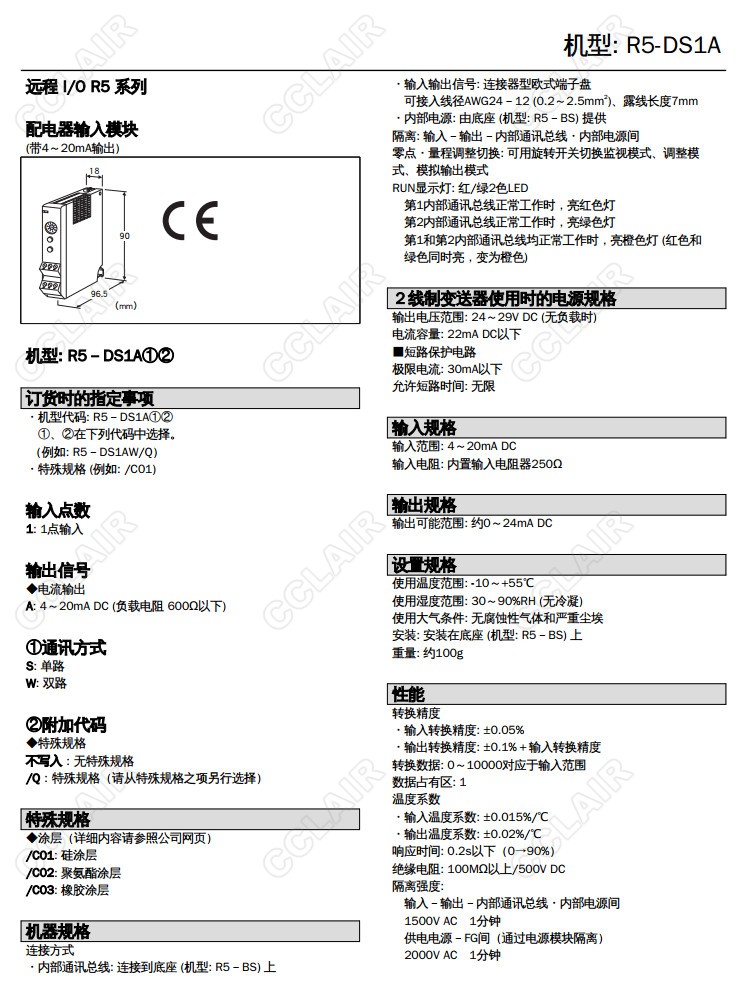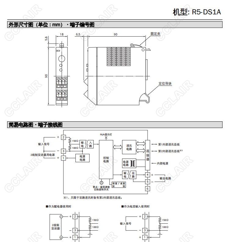 R5-DS1A,R5-DS1AW/Q,R5-DS1AS/Q,配電器,輸入信號∶DC4~20mA,2線制變送器用電源電壓范圍∶DC24~28V (22mA以下),輸出信號∶DC4~20mA