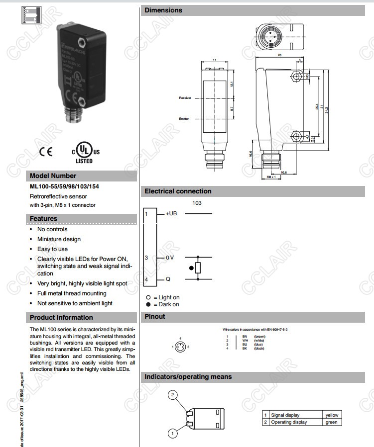 ML100-55/59/98/103/154,反射板型光電開關(guān)