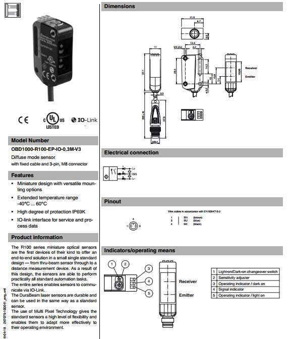 OBD1000-R100-EP-IO-0,3M-V3,漫反射型傳感