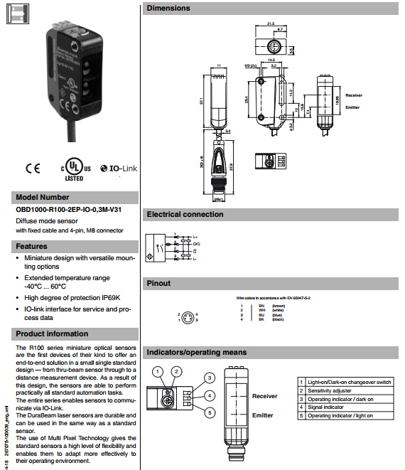 OBD1000-R100-2EP-IO-0,3M-V31,漫反射型傳感器