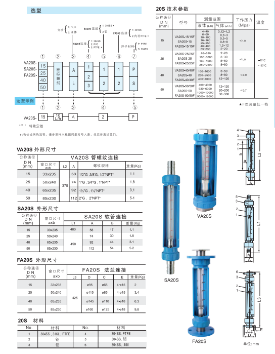 20S玻璃轉(zhuǎn)子流量計(jì)與同類產(chǎn)品比較具有測量精度高,互換性能好,連接方式多樣化,VA20S管螺紋連接,SA20S軟管連接,F(xiàn)A20S法蘭連接,精度等級互換2.5級,單標(biāo)1.5級.